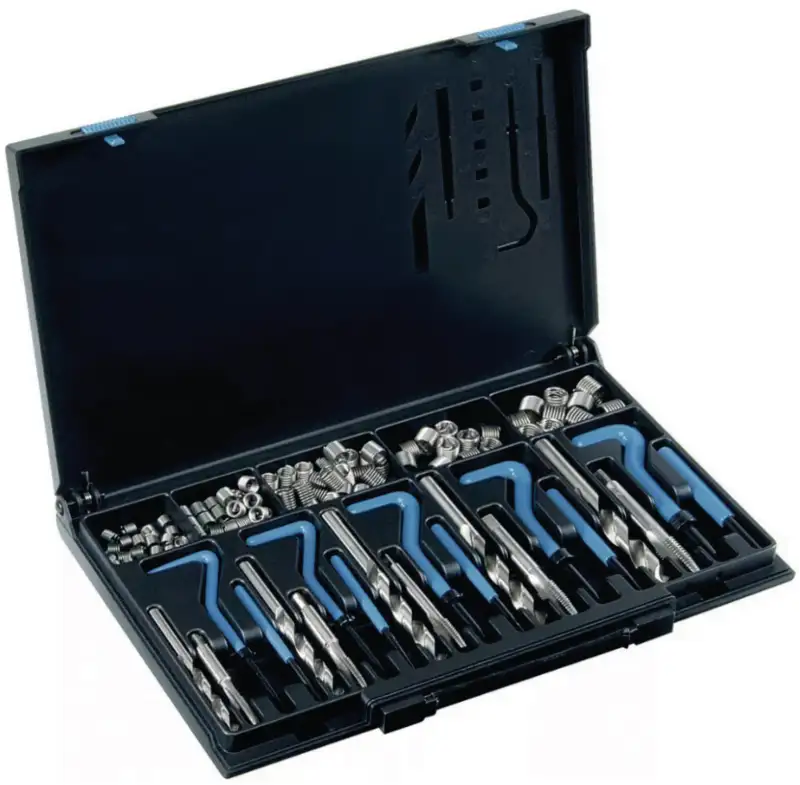 Sortiment mit gängigsten Abmessungen in ansprechender funktionalen Verpackung. Bestehend aus Spiralbohrer, Gewindebohrer, Zapfendreher, Handeinbauwerkzeug und Gewindeeinsätzen.