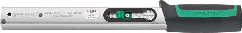Stahlwille 730 Quick, für Rechts- und Linksanzug. Ergonomisch und komfortabl; Verbesserte Zugänglichkeit und Betätigung des im Griff versenkten Klemmhebels. Optimierter Ballengriff für ermüdungsfreies Arbeiten. Die neue Konstruktion mit gegenüberliegenden, v-förmigen Einfassungen ermöglichen ein schnelles, exaktes Einstellen – auch bei ungünstigem Blickwinkel. Klickt bei Auslösung automatisch gut hör- und spürbar aus. Genauigkeit ±4%, mit Kalibrierschein gemäß DIN EN ISO 6789-2:2017. Robuste Konstruktion, Schnelleinstellung des Drehmoments mit Schieber und Arretierungstaste.