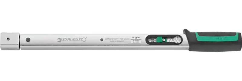 Stahlwille 730 Quick, für Rechts- und Linksanzug. Klickt bei Auslösung automatisch gut hör- und spürbar aus. Genauigkeit ±4%, mit Kalibrierschein gemäß DIN EN ISO 6789-2:2017. Robuste Konstruktion, Schnelleinstellung des Drehmoments mit Schieber und Arretierungstaste.