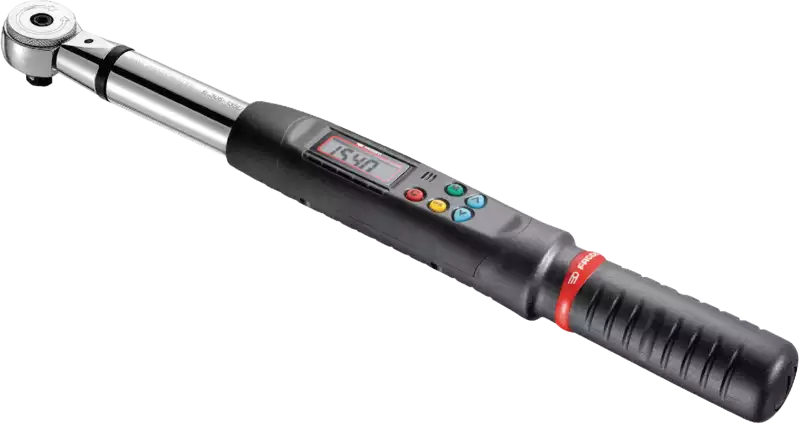 Facom E.306A, für Rechts- und Linksanzug, sehr einfache Bedienung, Selbsttest und Nullstellung beim Einschalten, Genauigkeit ±2%, ±1 Digit (20% - 100% des Messbereichs), Voreinstellung von 9 Drehmomentwerten möglich, Speicher für 250 Werte, mit USB Anschluss, Leuchtanzeige und akustischem Signal (LED und Summer), Erkennung der LED-Anzeige auch bei schwierigem Zugang; Messmodus: Spitzenwert oder Mitlaufmessung. Lieferumfang: Einsteck-Umschaltknarre, Batterien, Software und Datenkabel, Werksprüfzertifikat nach ISO 6789, in Kunststoffkasten.