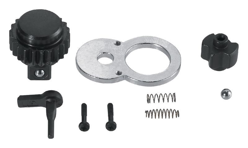 Inhalt: 1 Drehteil mit Vierkant 1/4", 1 Sperrscheibe, 1 Schalthebel mit Stift, 1 Kugel, 2 Druckfedern, 2 Halteschrauben M 1.7 x 8 mm, 1 Abdeckplatte.