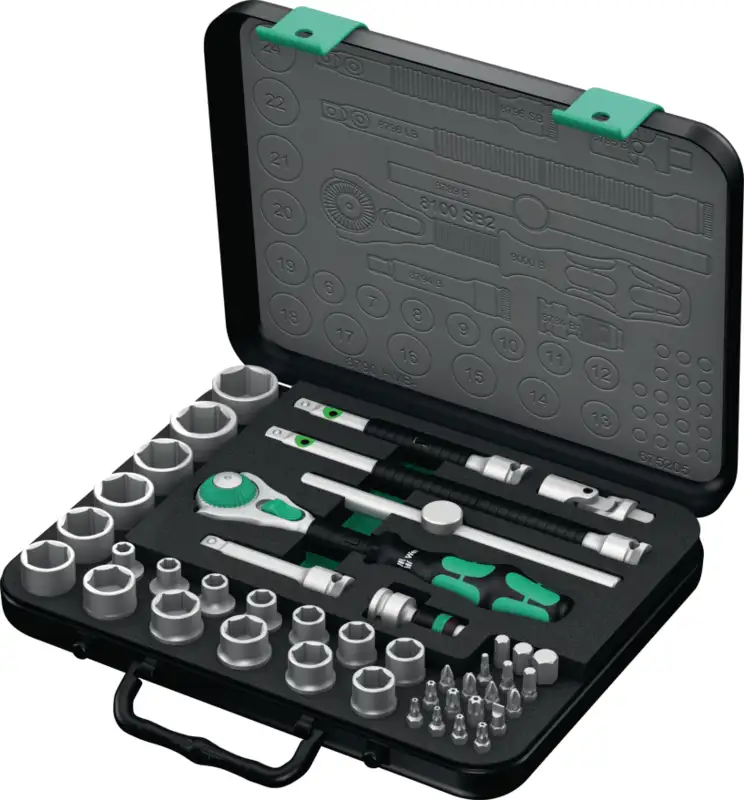Der Sechskant-Steckschlüsselsatz 8100 SA 2 Zyklop Speed-Knarrensatz von WERA vereint Präzision, Geschwindigkeit und Vielseitigkeit in einem kompakten Premium-Set. Herzstück ist die innovative Zyklop Speed-Knarre, die dank ihrer freidrehenden Schnellverstellung ein besonders schnelles Arbeiten ermöglicht. Mit ihrer feinverzahnten Mechanik eignet sie sich perfekt für präzises Schrauben, auch in engen Bauräumen. Mehrere fest einstellbare Arbeitspositionen sorgen für maximale Flexibilität und erlauben den Einsatz sogar wie bei einem Schraubenzieher. Die robusten Sechskant-Stecknüsse aus hochwertigem Chrom-Vanadium-Stahl sind exakt gefertigt, mattverchromt und bieten optimalen Korrosionsschutz.