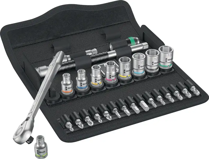 Der Sechskant-Steckschlüsselsatz 8100 SA 8 Zyklop Metal-Knarrensatz von WERA vereint maximale Robustheit, präzises Arbeiten und hohe Geschwindigkeit in einem kompakten Premium-Set. Herzstück ist die innovative Zyklop Metal-Knarre, die dank ihrer durchdachten Konstruktion äusserst schlanke Abmessungen bietet und selbst unter engsten Platzverhältnissen effizientes Arbeiten ermöglicht. Die feinverzahnte Mechanik sorgt für exaktes Schrauben und einen sauberen Kraftschluss auch bei präzisen Anwendungen. Die dauerhaft belastbaren Sechskant-Stecknüsse bestehen aus hochwertigem Chrom-Vanadium-Stahl, sind präzise gefertigt, mattverchromt und zuverlässig gegen Korrosion geschützt.