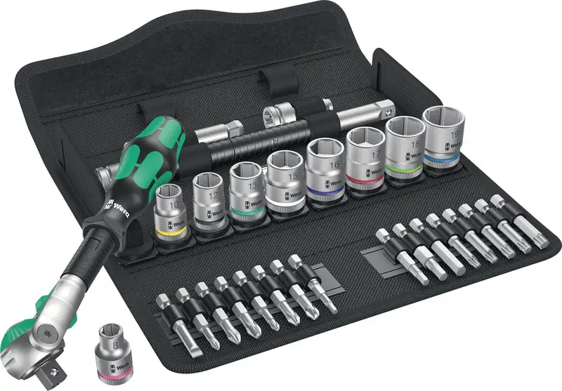 Der Sechskant-Steckschlüsselsatz 8100 SB 6 Zyklop Speed-Knarrensatz von WERA vereint höchste Präzision, Geschwindigkeit und Vielseitigkeit in einem kompakten Premium-Set. Im Mittelpunkt steht die innovative Zyklop Speed-Knarre, die dank freidrehender Schnellverstellung besonders effizientes Arbeiten ermöglicht. Die feinverzahnte Mechanik sorgt für einen äusserst geringen Rückholwinkel, sodass selbst enge oder schwer zugängliche Bereiche schnell und präzise bearbeitet werden können. Die Einsätze aus hochwertigem Chrom-Vanadium-Stahl sind präzise gefertigt, mattverchromt und optimal gegen Korrosion geschützt. Das kompakte Textil-Tool-Case garantiert sicheren Transport und eine übersichtliche Aufbewahrung.