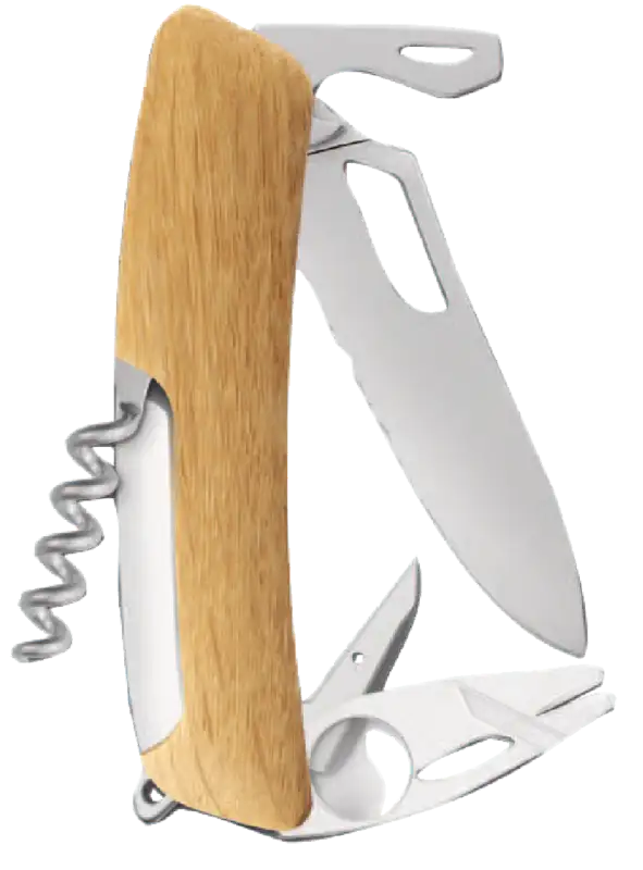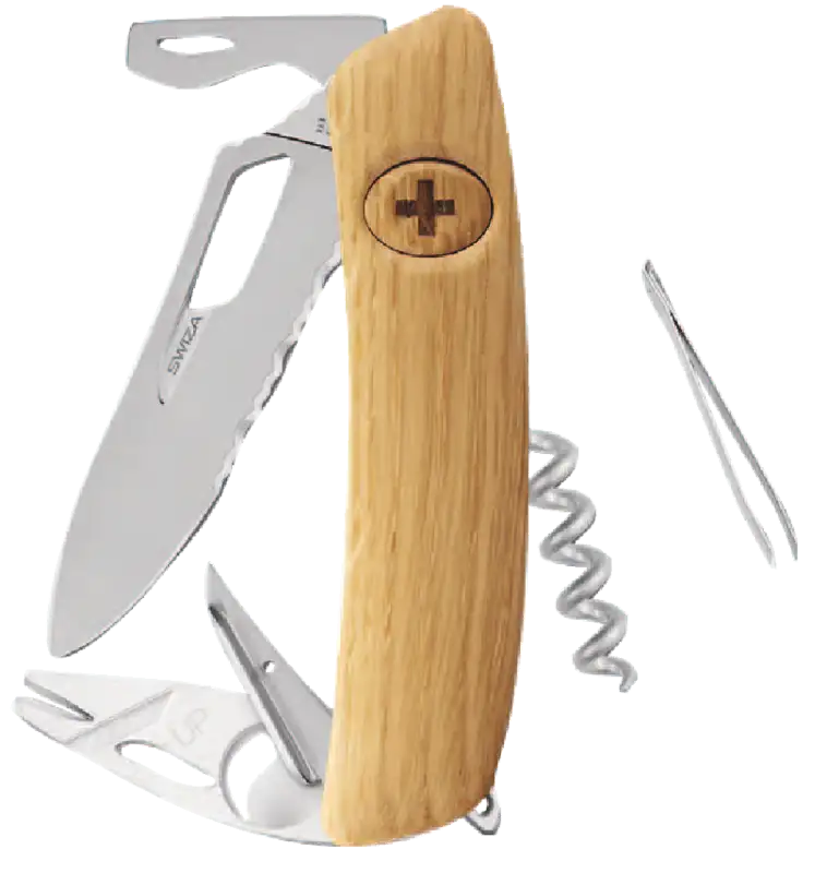 Die Eiche, als Königin der Schweizer Wälder, symbolisiert Adel und Weisheit. SWIZA hat sich entschieden, dieses edle Holz für den Griff eines seiner Flaggschiff-Messer zu verwenden: das SH03 TR TT. Dieses Modell vereint Tradition und Innovation, indem es einerseits auf das Eichenholz als Griffmaterial setzt und andererseits ein patentiertes Zeckenziehwerkzeug integriert. Die gezackte Klinge ist so gestaltet, dass sie sich leicht mit einer Hand öffnen lässt, egal ob Sie Rechts- oder Linkshänder sind.