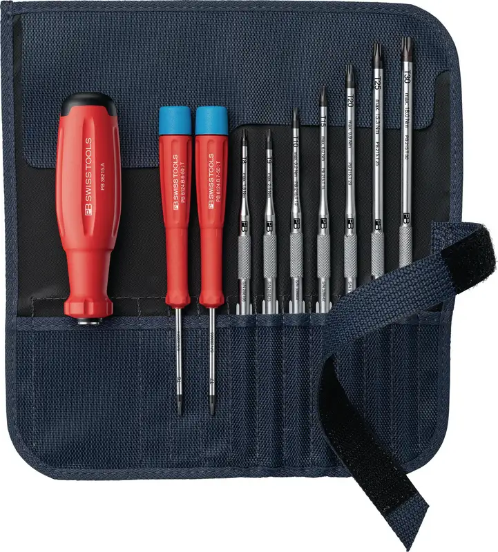SwissGrip Evo Schraubenzieher Set mit Wechselklingen in kompakter Stoff-Rolltasche, für Torx®-Schrauben T6 bis T30. Neun professionelle Qualitätswerkzeuge auf engstem Raum. Beständiger Griff für müheloses Arbeiten bei hohen Drehmomenten.