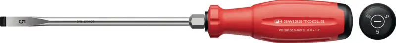 SwissGrip Evo Schraubenzieher für Schlitz-Schrauben, in Sonderlänge. Beständiger Griff für müheloses Arbeiten bei hohen Drehmomenten. Farbcode pro Schraubentyp. Parallele Spitze, optimale Kraftübertragung, keine Auswurfkraft (kein Cam-Out Effekt).