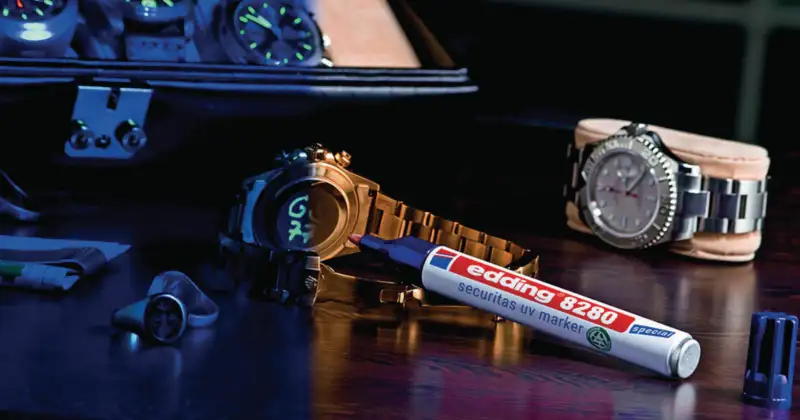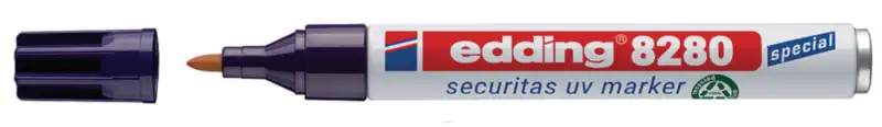 Der Permanentmarker Securitas 8280 UV von edding ermöglicht dauerhafte Markierungen, die nur unter UV-Licht sichtbar werden. Die Spezialtinte erscheint erst unter UV-Licht und eignet sich daher optimal für diskrete, fälschungssichere oder sicherheitsrelevante Kennzeichnungen. Die schnell trocknende, wisch- und wasserfeste Tinte haftet zuverlässig auf fast allen Materialien.