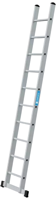 Sprossen-Anlegeleiter, sehr leicht und zugleich äußerst stabil. Auswechselbare 2-Komponenten-Kunststoffschuhe für rutschsicheren Stand und zugleich festen Sitz im Holm. Sprossen-Holm-Verbindung durch hochfeste ZARGES Qualitätsbördelung.