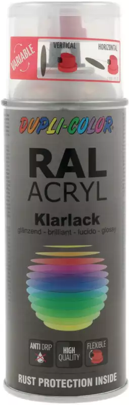 DUPLI-COLOR, RAL-Acryl Klarlack ist ein hochwertiger, kristallklarer Überzugslack für Sprühlacke auf Acryl- und Nitrokombinationsbasis wie z.B. Metallic-, Neon- und weitere Farbsprays.