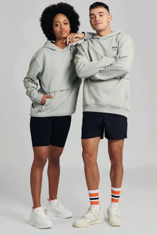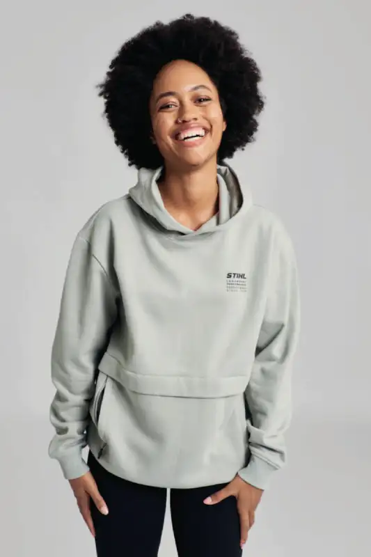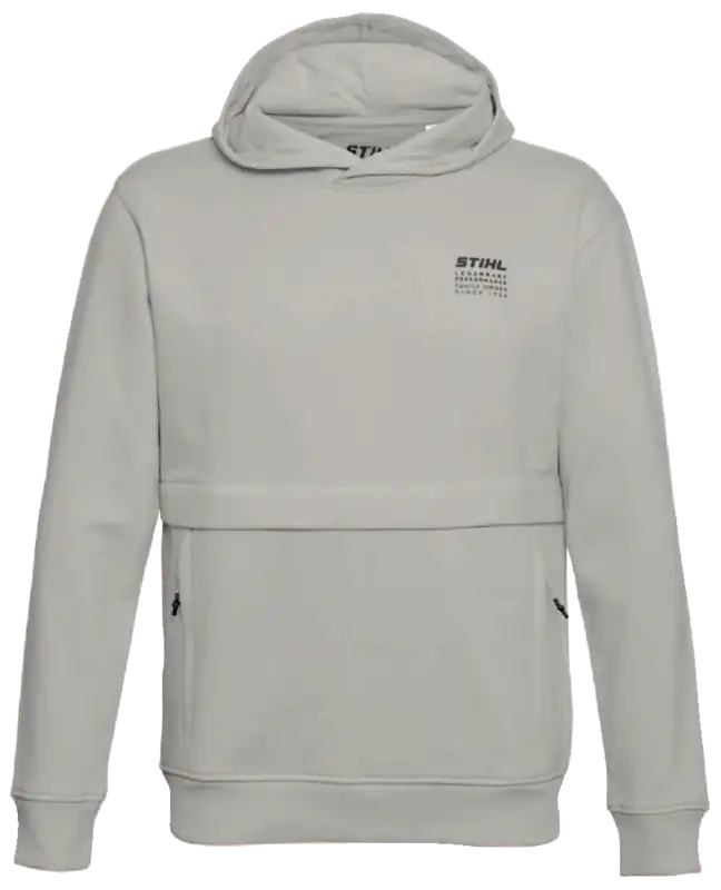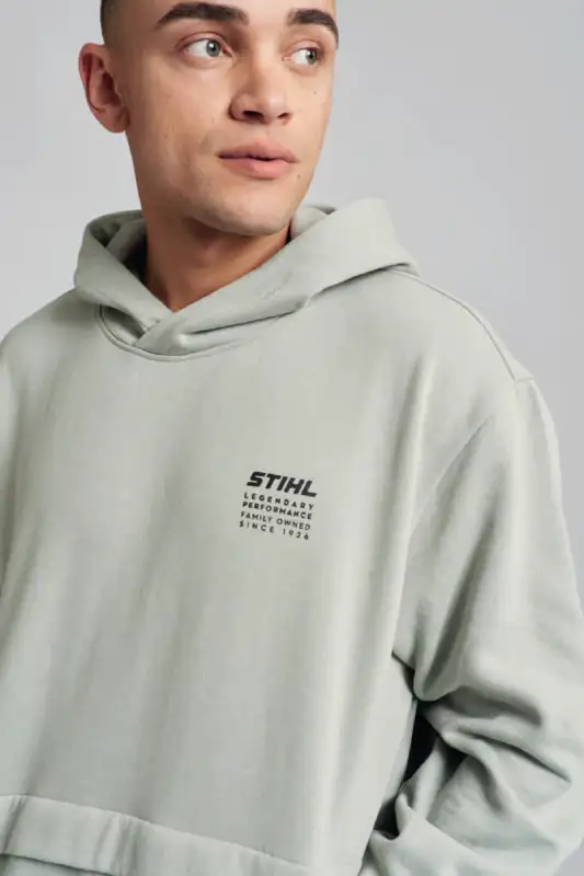 Ein echtes Highlight ist die Bauchtasche mit Reissverschluss: Schlüssel, Smartphone und andere Essentials sind darin sicher verstaut – nichts fällt heraus. Auf der linken Brust setzen ein dezentes schwarzes STIHL Logo sowie der Schriftzug "STIHL LEGENDARY PERFORMANCE" einen klaren Markenakzent. Dank Unisex-Passform passt der Hoodie zu jedem Look und lässt sich vielseitig kombinieren.