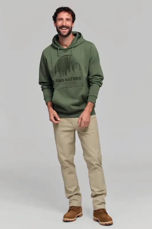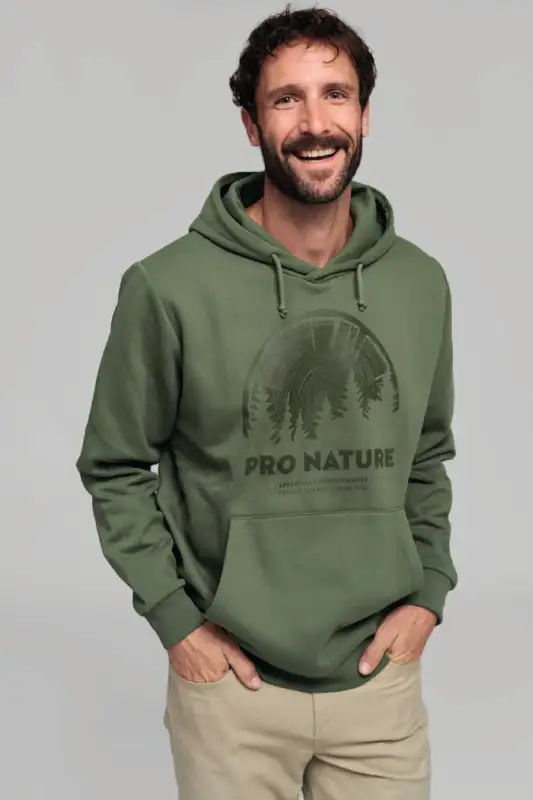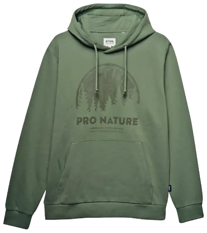 Der STIHL Hoodie PRO NATURE in Grün steht für die enge Verbundenheit von STIHL mit Wald und Natur. Das tonale Puff-Print-Motiv auf der Vorderseite zeigt einen Baumstamm mit Waldszene und dem Schriftzug "PRO NATURE" – ein klares Bekenntnis zu verantwortungsvollem Arbeiten im Freien.