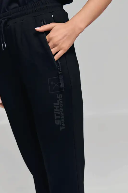 Optische Akzente setzt der seitlich am linken Hosenbein platzierte, gestürzte "STIHL TIMBERSPORTS®"-Logo-Print sowie die markanten, quadratisch gerahmten gekreuzten Äxte. Zwei seitliche Hosentaschen vorne und eine Gesässtasche hinten – alle mit Reissverschluss – bieten sicheren Stauraum für Schlüssel, Smartphone oder andere Essentials.