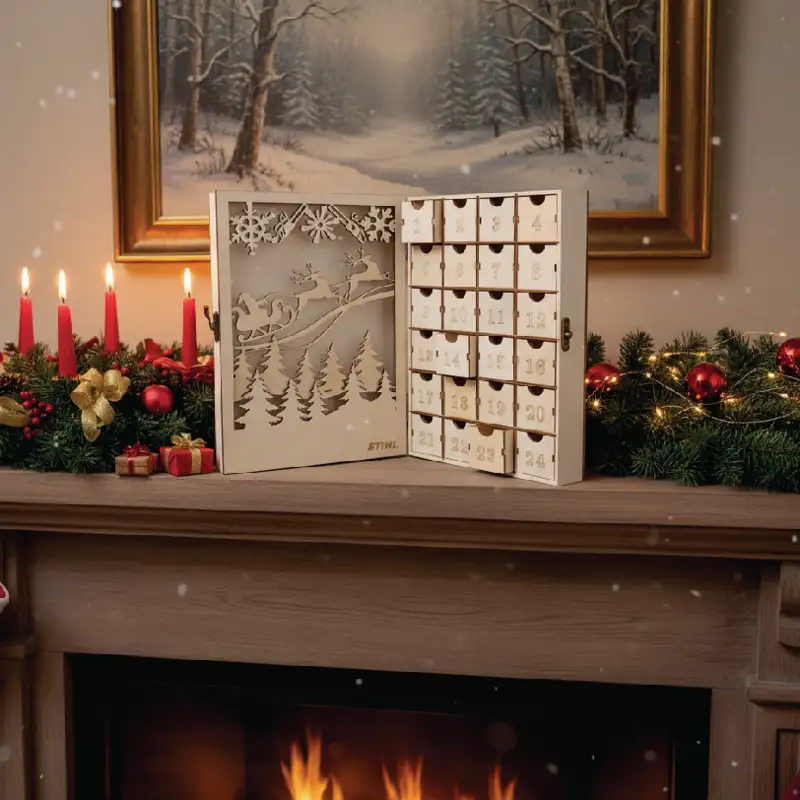 Die Vorderseite des Adventskalenders ziert ein charakteristisches STIHL Weihnachtsmotiv, das in zwei Ebenen gestaltet ist und dadurch einen beeindruckenden 3-D Effekt erzeugt. Auf der rechten Seite des Kalenders befinden sich 24 Türchen, die mit lasergravierten Ziffern versehen sind, um das Warten auf Weihnachten noch spannender zu gestalten.