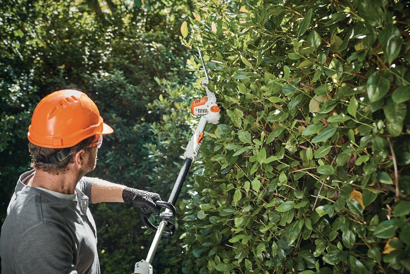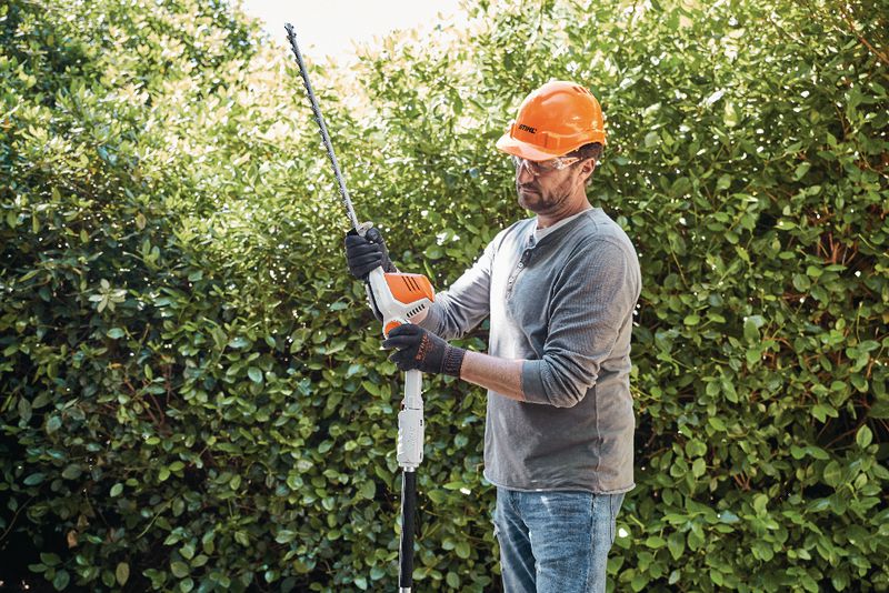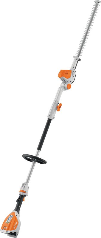 Leichter Akku-Heckenschneider zum Schneiden höherer Hecken und Sträucher im heimischen Garten. Einseitig geschliffene Messer in Tropfenform, Messerwinkel stufenweise einstellbar von - 45° bis + 90°, teilbarer Schaft für einfachen Transport. Transportlänge 115 cm, Gesamtlänge 210 cm.