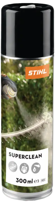 STIHL Superclean entfernt zuverlässig Harz, Rost und Schmutz von Schneidgarnituren, Heckenscherenmessern und Motorsägen. Die praktische 2-in-1-Formel reinigt nicht nur effektiv, sondern wirkt gleichzeitig als Schmiermittel und Korrosionsschutz.
