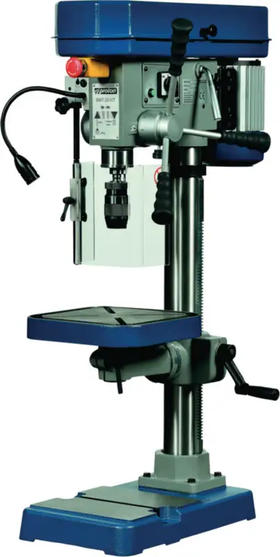 Die Tischbohrmaschine BMT-2010T von PROTON überzeugt durch ihre robuste Bauweise und präzise Bohrleistung. Das stabile Gussgehäuse in Kombination mit dem sorgfältig gelagerten Bohrfutter gewährleistet exakte Bohrungen in einer Vielzahl von Materialien. Der leistungsstarke Motor sorgt auch bei härteren Werkstoffen für sauberes Arbeiten. Die Drehzahl lässt sich komfortabel über den Keilriemen anpassen, sodass sie optimal auf das jeweilige Material abgestimmt werden kann. Der höhenverstellbare Bohrtisch ist neigbar, wodurch selbst schräge Bohrungen präzise durchgeführt werden können. Die Tischhöhe wird über den Klemmring an der Säule eingestellt, sodass individuelle Arbeitspositionen mühelos realisierbar sind. Dank ihrer kompakten Bauweise eignet sich die BMT-2010T für stationären Einsatz, ideal für Werkstatt oder Fertigungsbereich.