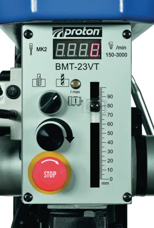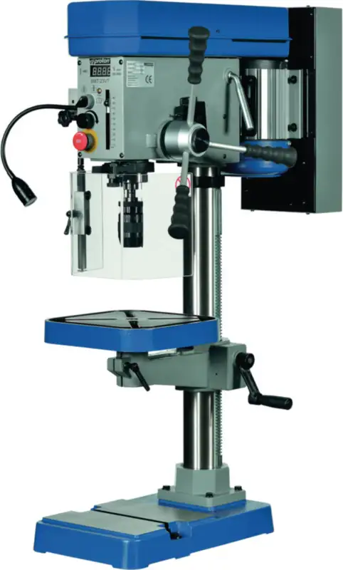 Die Tischbohrmaschine BMT-23VT von PROTON überzeugt durch ihre robuste Bauweise und präzise Bohrleistung. Das stabile Gussgehäuse in Kombination mit dem sorgfältig gelagerten Bohrfutter gewährleistet exakte Bohrungen in einer Vielzahl von Materialien. Der leistungsstarke Motor sorgt auch bei härteren Werkstoffen für sauberes Arbeiten. Die Drehzahl lässt sich stufenlos regulieren, sodass sie optimal auf das jeweilige Material und den Bohrdurchmesser abgestimmt werden kann. Zusätzlich verfügt die Maschine über eine Gewindeschneidfunktion, die ein präzises Schneiden von Gewinden direkt an der Bohrmaschine ermöglicht. Der höhenverstellbare Bohrtisch ist neigbar, wodurch auch schräge Bohrungen präzise durchgeführt werden können. Die Tischhöhe wird über den Klemmring an der Säule eingestellt, sodass individuelle Arbeitspositionen mühelos realisierbar sind.