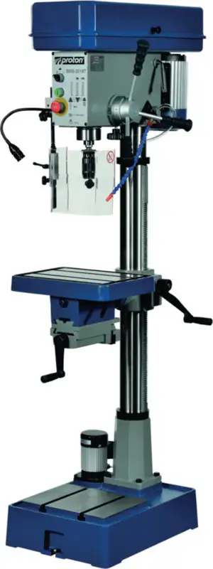 Die Säulenbohrmaschine BMS-3018T von PROTON ist mit einem integrierten Kühlmittelsystem ausgestattet und ermöglicht präzises Arbeiten auch bei anspruchsvollen Bohrungen. Über die Schnell- und Langsam-Funktion können zwei Drehzahlbereiche mit jeweils neun Stufen ausgewählt werden, um das optimale Drehmoment für verschiedene Materialien zu gewährleisten. Der Tisch ist schwenkbar und verfügt über zwei Parallelnuten zur Befestigung von Spannwerkzeugen sowie einen integrierten Schraubstock. Die Tischhöhe lässt sich bequem über die Kurbel und die seitliche Zahnstangenverstellung an der Säule anpassen. Der Keilriemen wird über den seitlichen Spannhebel und die Motorenfederung gespannt, was eine gleichmässige Kraftübertragung gewährleistet. Zusätzlich ist die Säulenbohrmaschine mit einer flexiblen LED-Arbeitsleuchte ausgestattet, die den Arbeitsbereich optimal ausleuchtet.
