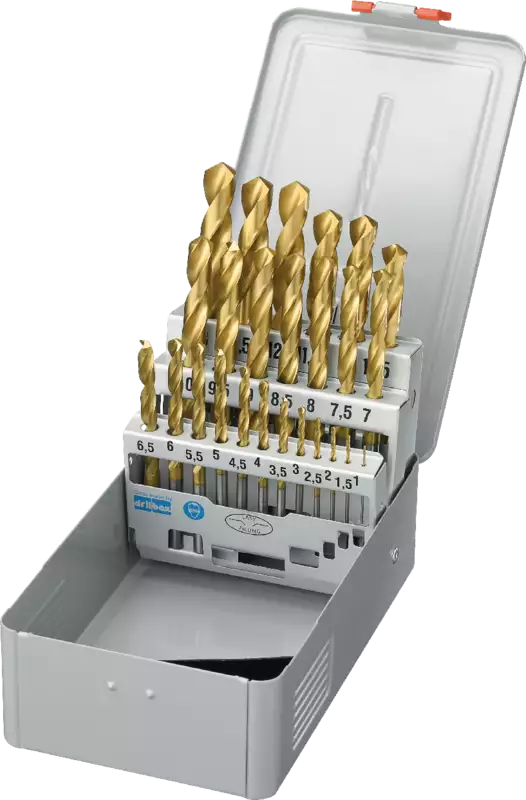 Aufgefüllt in aufklappbarer Metallkassette, Typ N, Nuten geschliffen, HSS, TiN-Beschichtung, Spitzenwinkel 118°, Zylindrisch (ohne Fläche, HA), DIN 338