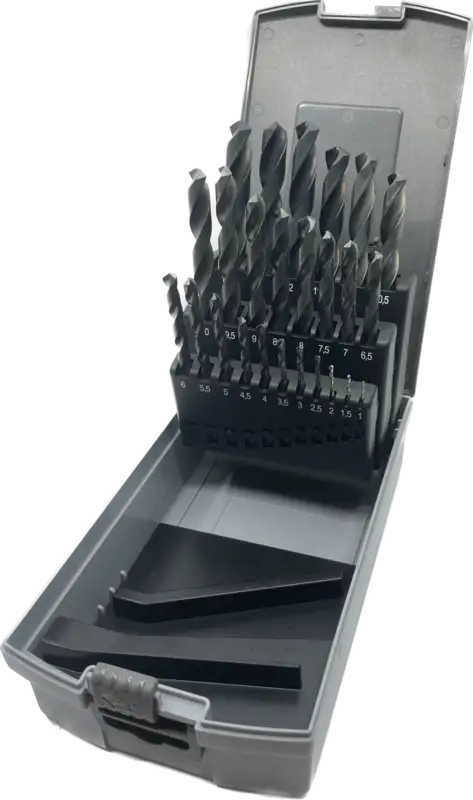 Aufgefüllt in aufklappbarer Kassette, Typ N, Nuten geschliffen, HSS, Spitzenwinkel 118°, Zylindrisch (ohne Fläche, HA), DIN 338