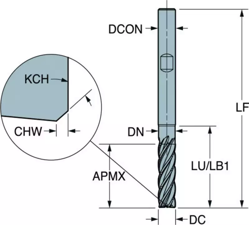 VHM, Ø 6-20 mm, AlCrN-Beschichtung, Drallwinkel 36°, Schneidentoleranz h10, Weldon (mit Fläche, HB), Schafttoleranz h6, mittellang, mit Schutzfase, Anzahl Zähne 5, DIN 6535