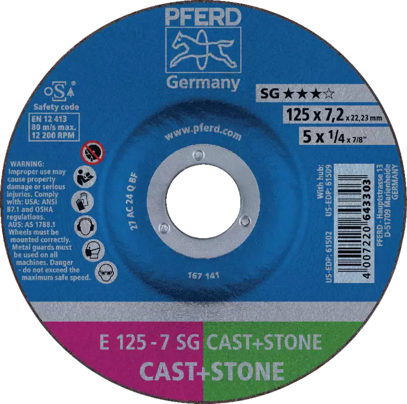 Form E 27, Schleifmittel Siliciumcarbid C, für Gusseisen/Gusshaut, hartes Aluminium, Stein. Für Flächenschliff, Anfasen und Entgraten. Profi-Werkzeug in mittelharter Ausführung Härte Q mit hoher Schleiffreudigkeit und sehr guter Standzeit. Bevorzugt auf leistungsstarken Winkelschleifern einsetzbar.