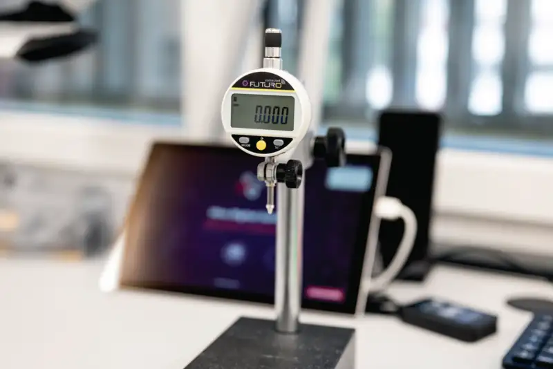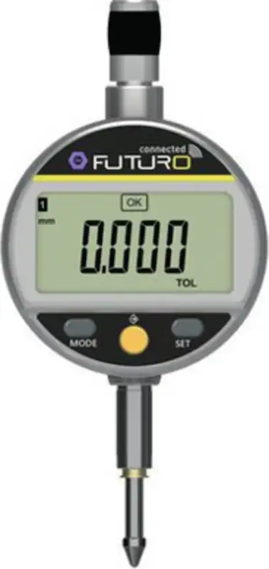 Digitale Messuhr FUTURO connected mit Bluetooth-Schnittstelle. 59,5 mm grosses, um 270° drehbares Gehäuse mit grossem Display und einer Auflösung von 0,001 mm, mit LED-Anzeige des Toleranzstatus für eine schnelle und präzise Entscheidungsfindung. Batteriefreier Betrieb dank der Datenausgabe „Proximity“ und „Power“. Integrierte Bluetooth-Datenübertragung für eine schnelle und fehlerfreie drahtlose Übertragung. Langlebiges Design, nach Schutzart IP54 beständig gegen Wasser und Kühlmittel. Praktische Funktionen wie MIN/MAX/DELTA, TOL, Faktor, PRESET und AUTO OFF, mit automatischem Aufwachen durch Bewegung und Ruhemodus nach 10 Minuten Inaktivität.