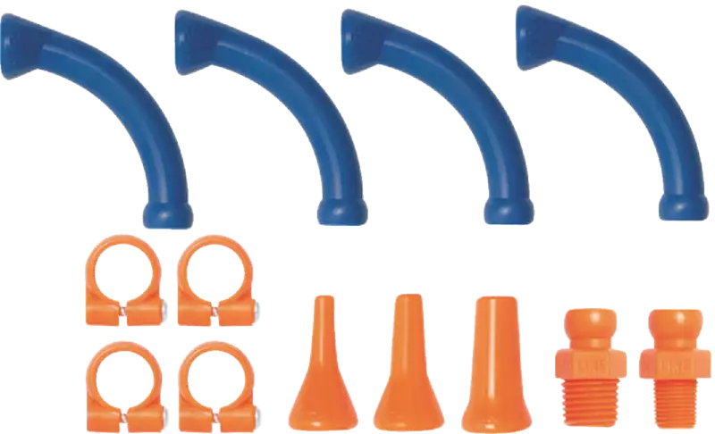Mit gebogenem 90° Schlauchstück mit 54 mm Radius, um bei engen Platzverhältnissen optimal zu kühlen; bei Verwendung der Klemmringe kann ein höherer Kühlmitteldruck erreicht werden, der Maximaldruck variiert unter Verwendung verschiedener Bauteile.