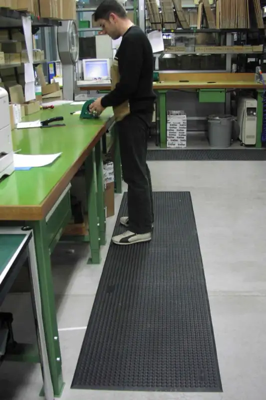 aus antistatischem Material, mit Kammerprofil und Noppen, komplett aus Nitrilkautschuk. Aufgrund der Elastizität der Matten werden die Gelenke und die Muskulatur geschont. Öl-, fett- und kraftstoffwiderstandsfähige Qualität für hohe Beanspruchung.