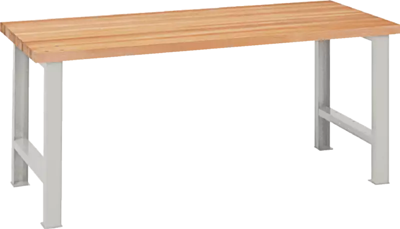 mit Buchenplatte aus gedämpften Buchenstäben, keilgezinkt, wasserfest verleimt, Kanten gebrochen, Oberfläche geschliffen, geölt und gewachst; mit 2 Werkbankfüssen, inklusive Vormontage.
