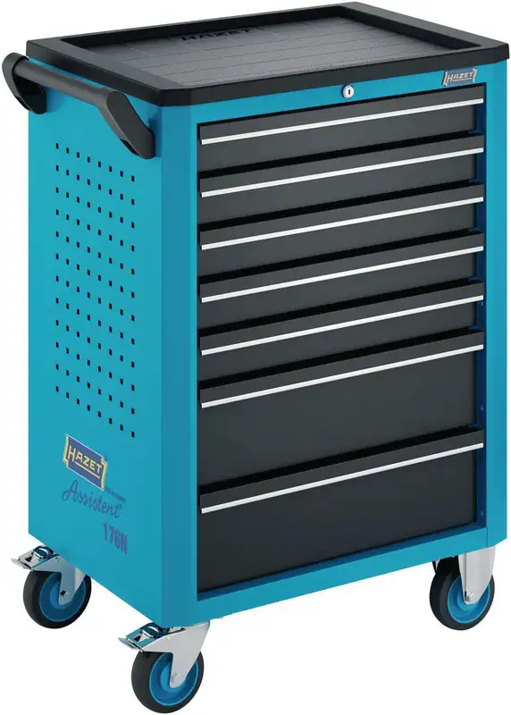 Der Werkstattwagen 176 N-7 von HAZET überzeugt durch Funktionalität, durchdachtes Design und langlebige Qualität. Mit seiner robusten Stahlkonstruktion und der cleveren Aufteilung erfüllt er die Anforderungen sowohl professioneller Anwender als auch ambitionierter Heimwerker. Ausgestattet mit sieben Schubladen bietet der Werkstattwagen reichlich Stauraum für Werkzeuge aller Art. Ein praktisches Verriegelungssystem stellt sicher, dass die Schubladen sicher verschlossen bleiben und ein ungewolltes Öffnen verhindert wird. Für maximale Mobilität sorgen leichtgängige Rollen, von denen zwei lenkbar und mit einer Feststellbremse ausgestattet sind. So lässt sich der Wagen auch bei voller Beladung mühelos bewegen und sicher positionieren. Die Arbeitsfläche auf der Oberseite des Wagens ist robust und ergonomisch gestaltet, ideal für kleinere Arbeiten oder das Ablegen von Werkzeugen während der Nutzung.
