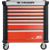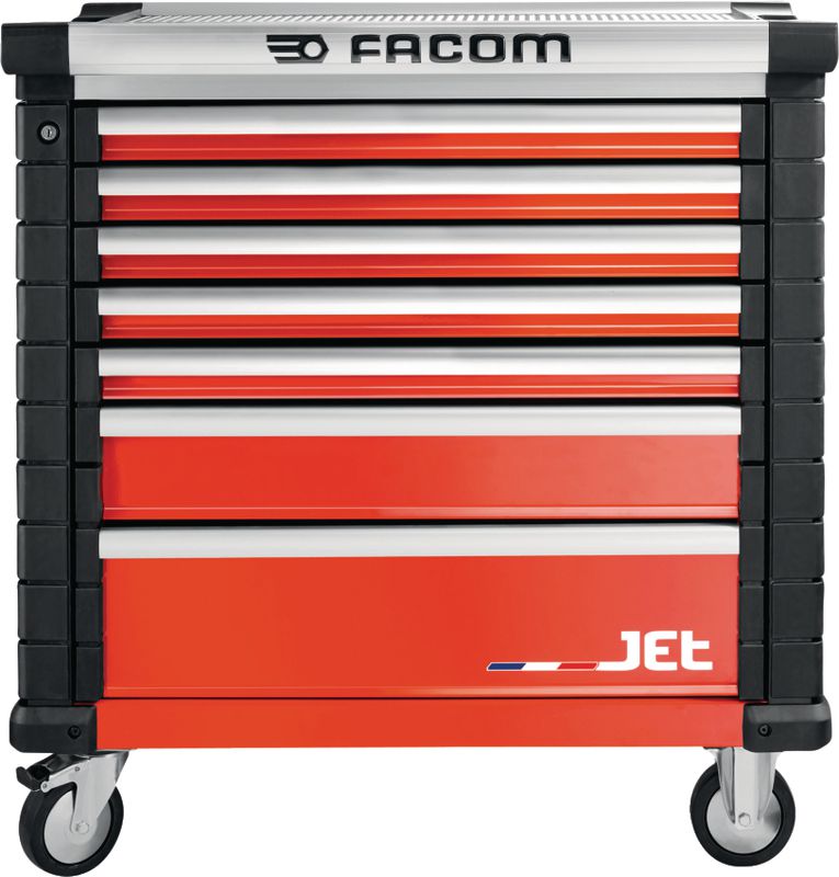 Facom Jet M4A mit 7 Schubladen, Aufnahmekapazität von 4 Werkzeugmodulen je Schublade; Schubladen mit Vollauszug und selbstschliessender Rückholfeder für effizienten und sicheren Verschluss, äusserst robuste Stahlblechkonstruktion mit SOFT-Puffern an den 4 Ecken, Arbeitsplatte aus tiefgezogenem Aluminium 2 mm mit Holzplatte 15 mm verstärkt, vollständig integrierter Fahrgriff, seitliche, unter Last absenkbare Kanten mit Aufnahmen für 8 Schraubenzieher. Zentralverriegelung mit Klappschlüssel; 4 Hochleistungsräder Ø 125 mm, 2 lenkbar, 2 fest, jeweils mit Feststellbremse. Seitenwände gelocht zum Aufhängen von Werkzeugen auf Haken bzw. Haltern. Seitenwände und Rückwand können verschiedene Zubehörteile wie Halterungen für Kanister, Zusatzschrank usw. aufnehmen.