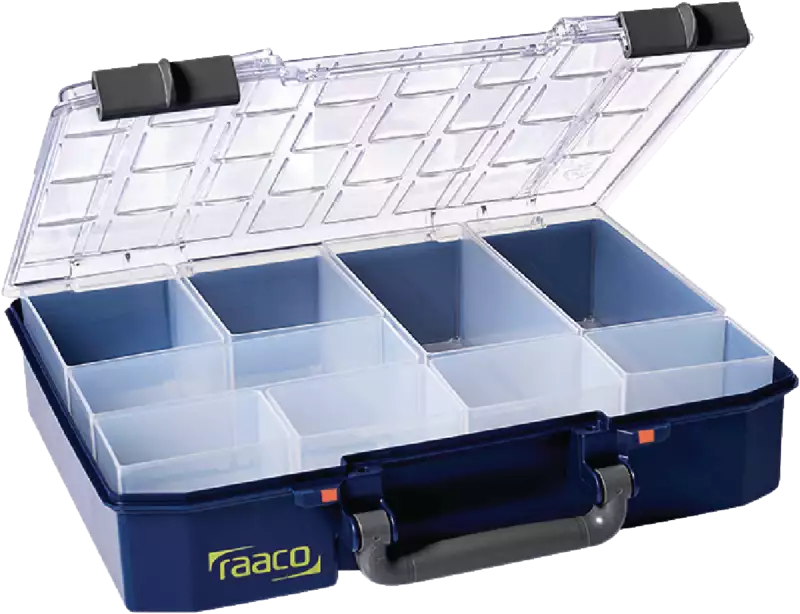 mit Schiebeverschlüssen und Tragegriff. Rastersysteme in Deckel und Boden verhindern ein Verrutschen des Inhalts. Hergestellt aus PP, Deckel aus PC.