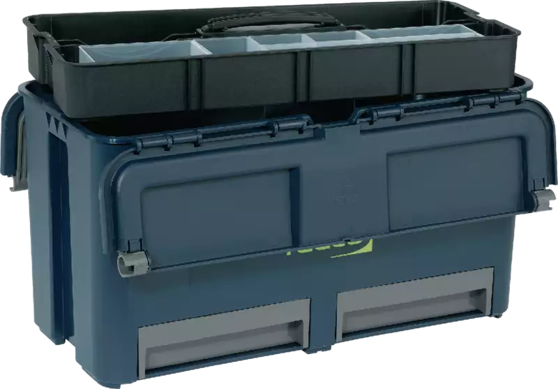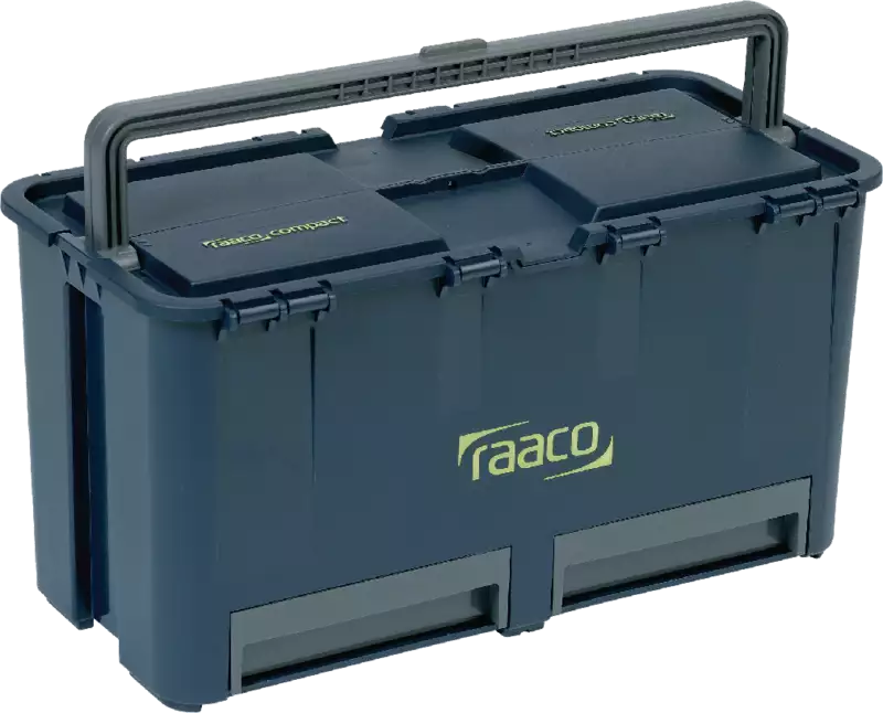 Werkzeugkoffer inkl. 6 Einsätze im herausnehmbaren Werkzeugträger, hergestellt aus PP, Farbe raaco blau.