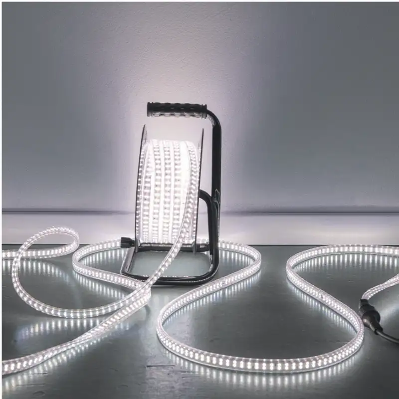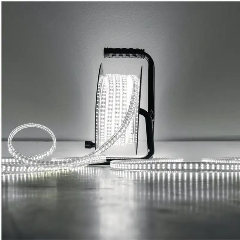Ruban lumineux à LED sur enrouleur de câble. Convient aux conditions difficiles et offre en même temps une lumière contrastée. Spécialement conçu pour une utilisation sur les chantiers, dans les ateliers, les entrepôts ou les zones industrielles.