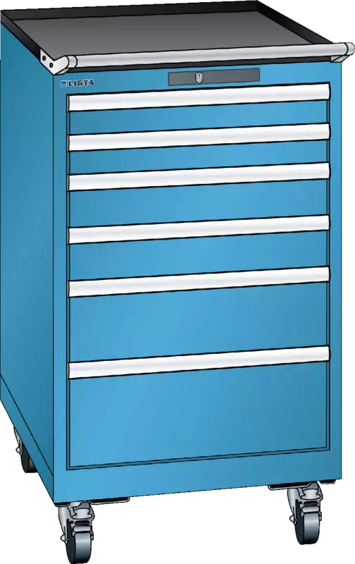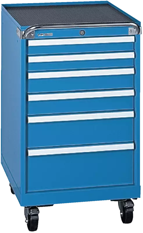 Construction solide en tôle d'acier, avec plateau de couverture à 4 bords relevés, caoutchouc cannelé noir, poignée coulissante, 2 roulettes fixes et 2 roulettes pivotantes (nylon Ø 100 mm) avec dispositif de verrouillage, tiroirs à extension totale, avec sécurité individuelle à droite, avec verrou cylindrique (Key Lock) avec 2 clés.