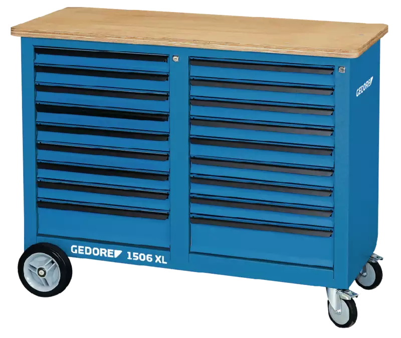 Gedore 1506 XL, en tôle d'acier inoxydable, revêtement en poudre anti-rayures. Plateau d'établi en bois de hêtre contreplaqué solide de 30 mm, surface également protégée par un vernis d'huile de lin. Grand espace de rangement avec étagère et porte. Deux blocs tiroirs de même hauteur avec de larges tiroirs à extension totale, amovibles, verrouillage centralisé avec verrou cylindrique, rails de guidage à roulement à billes, peut être équipé individuellement par des diviseurs en longueur et transversaux.