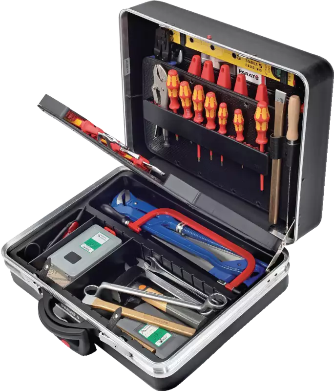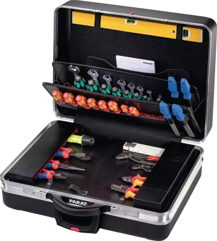 - Exécution PARAT CLASSIC, avec système porte-outils CP-7 à aménager individuellement pour Ø 11, 15 + 26 mm, 2 passants pour niveau à bulle, 4 passants à outils, 1 coque de fond avec plaque de recouvrement (hauteur 88 mm), compartimentable librement, 1 pochette