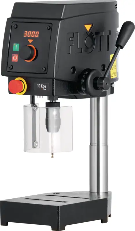 Flott TB Eco PLUS, capot de rotation solide et de haute qualité pour une lecture facile de la vitesse de rotation, butée de profondeur de perçage réglable rapidement et ergonomique avec échelle, contrôle continu de la vitesse de rotation avec affichage numérique, protection contre les surcharges thermiques, protection contre le perçage par fusible électronique, déclencheur à minimum de tension, bouton d'arrêt d'urgence, éclairage à LED, câble de raccordement.