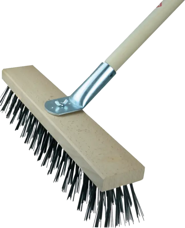 En bois de hêtre, avec poils en fil d'acier de 0.8 mm, avec manche et porte-manche.