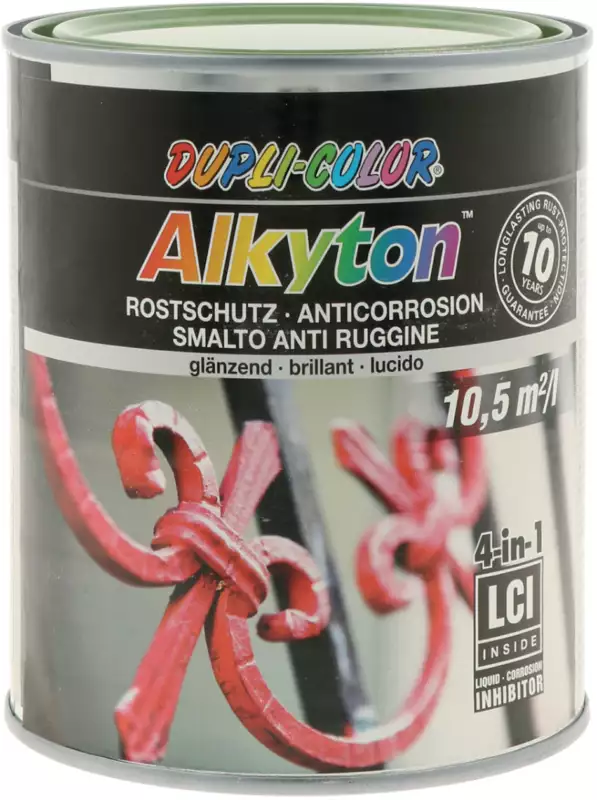 La peinture antirouille Alkyton DUPLI-COLOR forme une surface peinte extrêmement flexible. Elle peut être appliquée directement sur des résidus de rouille (après élimination manuelle de la rouille), sur l'acier, sur une sous-couche, sur le bois ou sur d'anciennes peintures avec une bonne adhérence en intérieur et en extérieur.