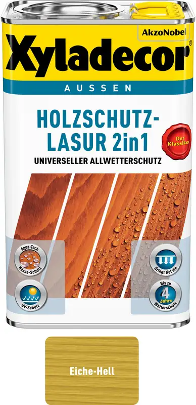 La lasure de protection du bois 2-en-1 chêne clair de XYLADECOR combine protection et entretien en une seule couche. Elle protège le bois à l'extérieur de manière fiable contre les intempéries, les rayons UV et l'humidité, tout en accentuant et en sublimant la veinure naturelle du bois.
