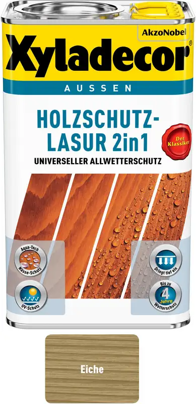 La lasure de protection du bois 2-en-1 chêne de XYLADECOR combine protection et entretien en une seule couche. Elle protège le bois à l'extérieur de manière fiable contre les intempéries, les rayons UV et l'humidité, tout en accentuant et en sublimant la veinure naturelle du bois.