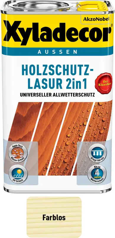 La lasure de protection du bois 2-en-1 incolore de XYLADECOR combine protection et entretien en une seule couche. Elle protège le bois à l'extérieur de manière fiable contre les intempéries, les rayons UV et l'humidité, tout en accentuant et en sublimant la veinure naturelle du bois.