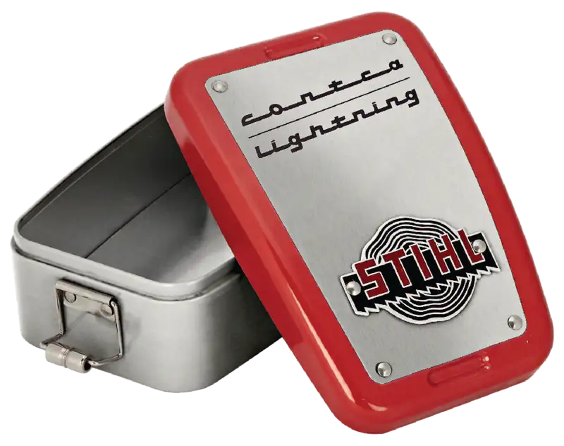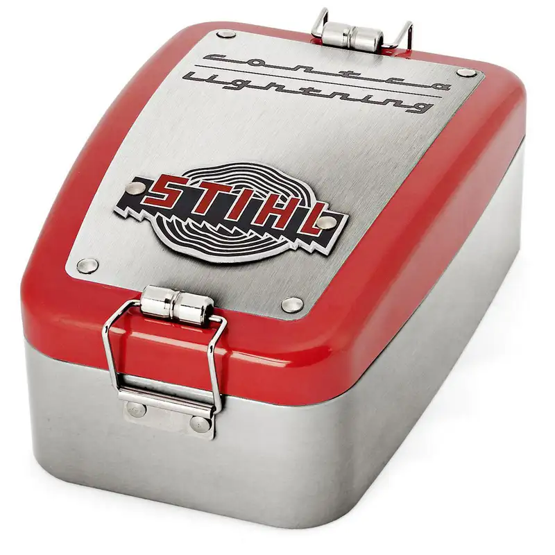 La boîte universelle STIHL CONTRA permet de tout ranger : des vieilles photos, des mèches de cheveux et des lettres d'amour aux joints d'étanchéité, petites pièces ou vis. Le couvercle s'inspire visuellement du capot de la légendaire STIHL CONTRA et fait de cette boîte un véritable accroche-regard pour l'atelier, la maison ou l'étagère d'un collectionneur.