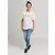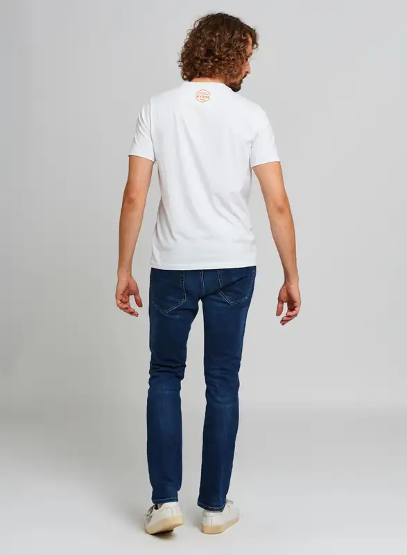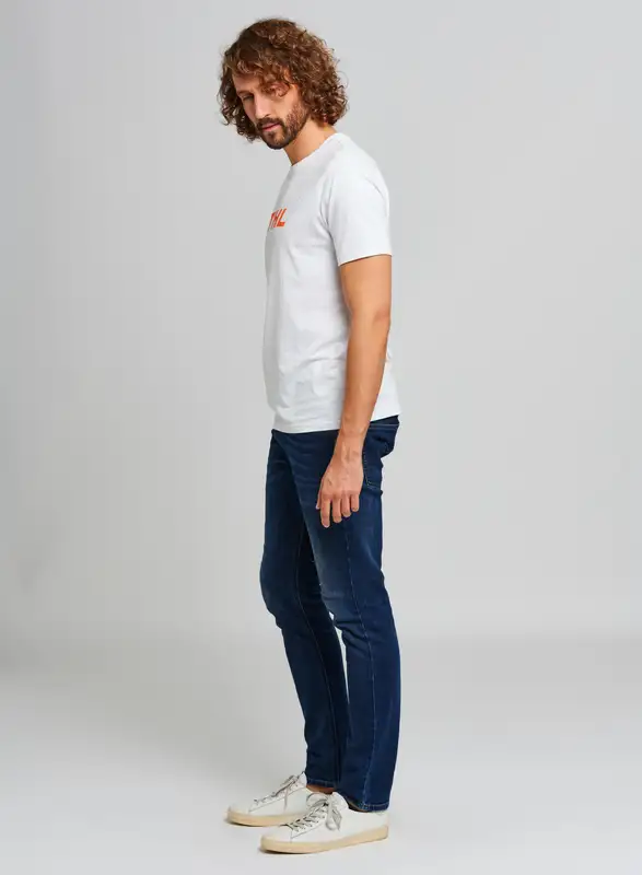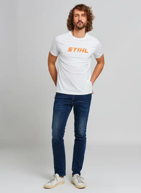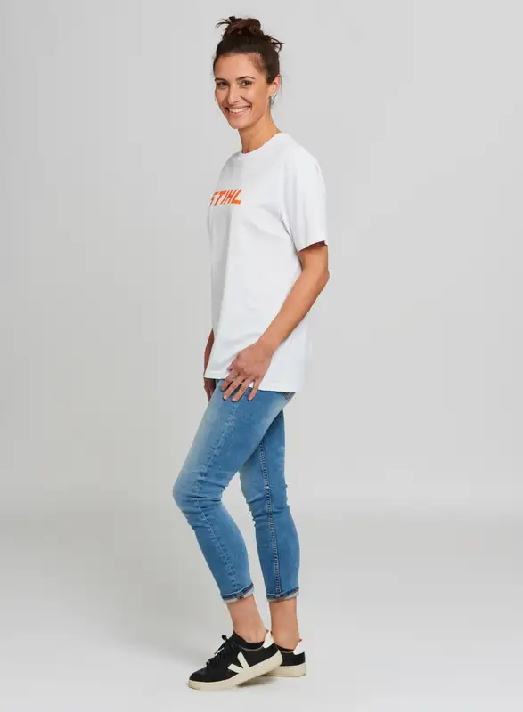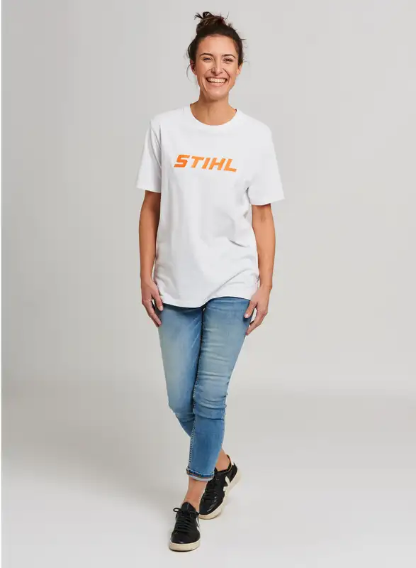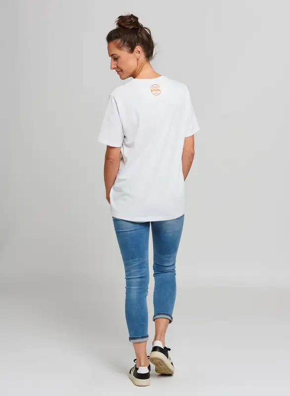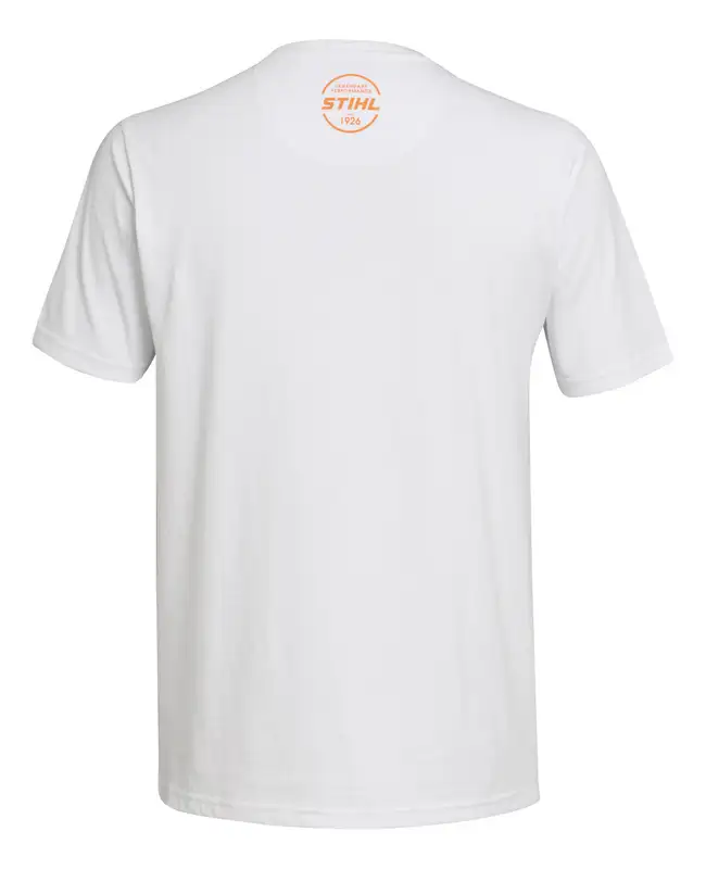 T-shirt blanc à col rond en jersey de haute qualité, avec un grand logo imprimé en orange contrastant. Etiquette du logo STIHL à l'intérieur, logo supplémentaire en orange à l'extérieur.