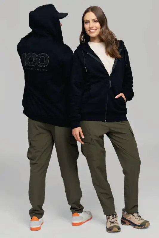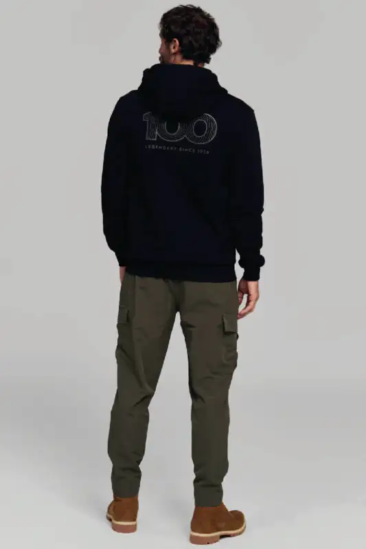 Fabriquée en 100 % coton biologique, cette veste à capuche est agréable à porter et offre un toucher de grande qualité. Un petit logo STIHL est imprimé sur la poitrine gauche. L'imprimé anniversaire noir réfléchissant « 100 LEGENDARY SINCE 1926 » au dos, qui ressort de manière impressionnante à la lumière, constitue un atout particulier.