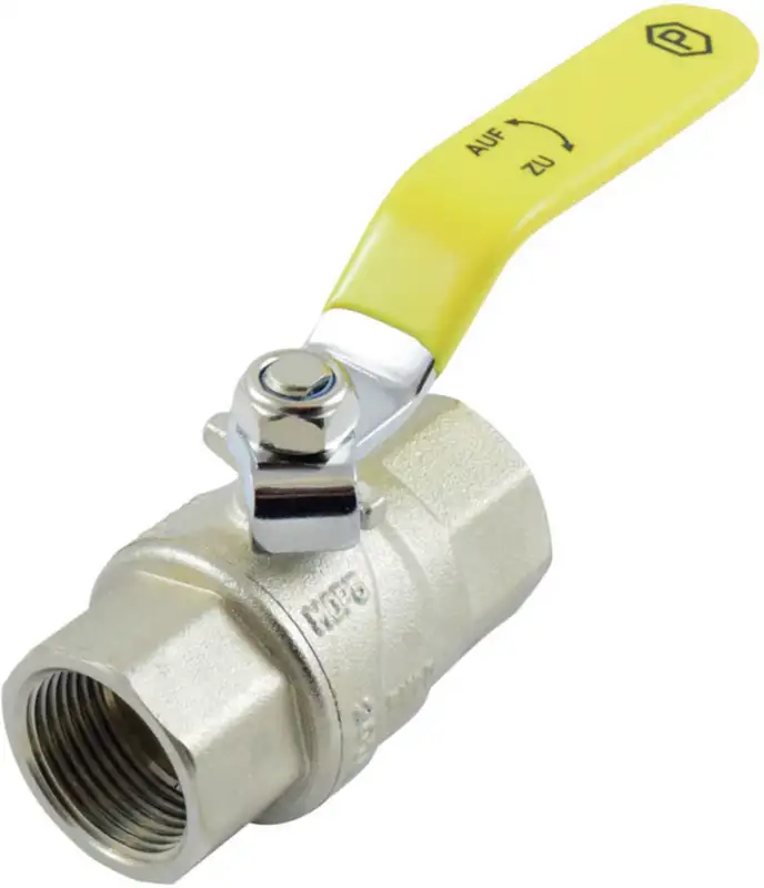 Vannes à bille à gaz en laiton nickelé avec filetage intérieur des deux côtés et poignée jaune. Convient à toutes les applications dans l'industrie du gaz. Passage complet.