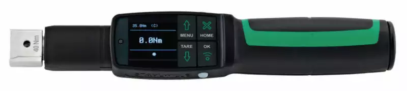 STAHLWILLE MANOSKOP® 714 - Avec affichage et déclenchement. Différence d'affichage du couple ± 2 %, ± 1 chiffre ; différence d'affichage de l'angle de rotation ± 1 %, ± 1 chiffre, 4 modes de mesure (couple, angle de rotation, couple avec contrôle de l'angle de rotation, angle de rotation avec contrôle du couple), afficheur graphique couleur haute résolution avec éclairages latéraux de signalisation, structure du menu à configurer librement. 3 modes de fonctionnement : avec déclenchement, Peak (affichage du fonctionnement avec valeurs de pointe) et Track (affichage du fonctionnement avec valeurs instantanées), interface micro-USB. Mesure de l'angle de rotation sans bras de référence, enregistrement de données (≤2.500 opérations de vissage), jusqu'à 200 types de vissage peuvent être programmés dans 25 processus au maximum, différentes limites de tolérance réglables en fonction du type de vissage. Évaluation sonore et visuelle du type de vissage, pas d'activation involontaire grâce au verrouillage du clavier. Protection anti-surcharge grâce à un signal d'avertissement sonore et visuel ainsi qu'un déclenchement forcé (droite), indication automatique de la prochaine date d'étalonnage en fonction du temps et/ou du nombre de cycle. Unités de mesure : Nm, ft/lb, in/lb. Couple de serrage correct automatique après saisie d'un entraxe différent, peut être réutilisé immédiatement après décharge. Serrage à droite et à gauche - pour serrages à gauche en mode de fonctionnement à déclenchement, l'outil enfichable doit être tournée de 180° le cas échéant. Signal de déclenchement sensible et sonore, couple et angle de rotation visibles simultanément. Contenu de la livraison : 2 certificats (couple, angle de rotation), logiciel SENSOMASTER Basic, câble USB, 4 micro-piles, dans un coffret (sans outil enfichable).